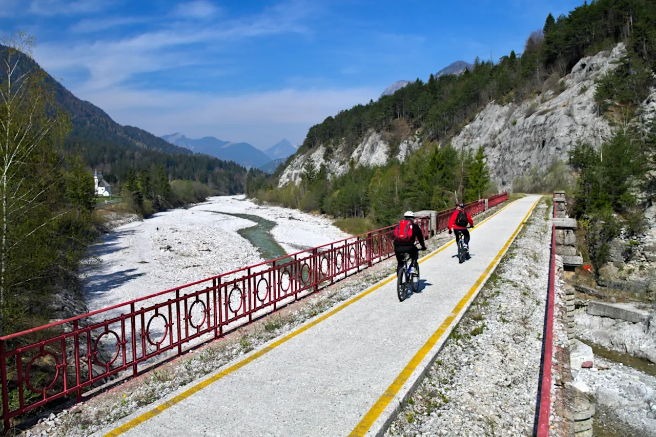 There is a dedicated cycle path following the former railway line along the river — part of the Alpe Adria cycle route.